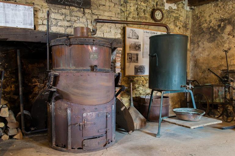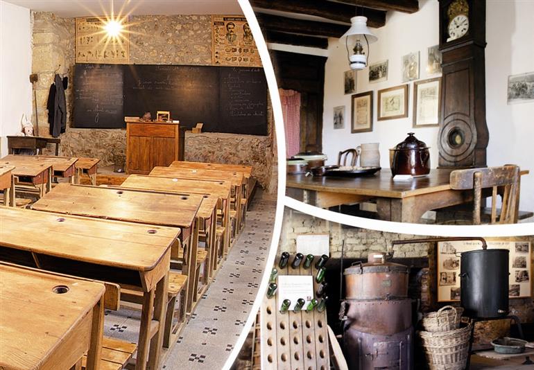 La maison champenoise - bâtiment du XVIIème siècle avec mobilier et objets de la vie quotidienne du début des années 1900, l'ancienne classe du village figée dans le temps (pupitres en bois, encrier, blouse,…), la distillerie - ancien atelier public de distillation avec les machines du début du siècle et la reconstitution d’une tonnellerie.