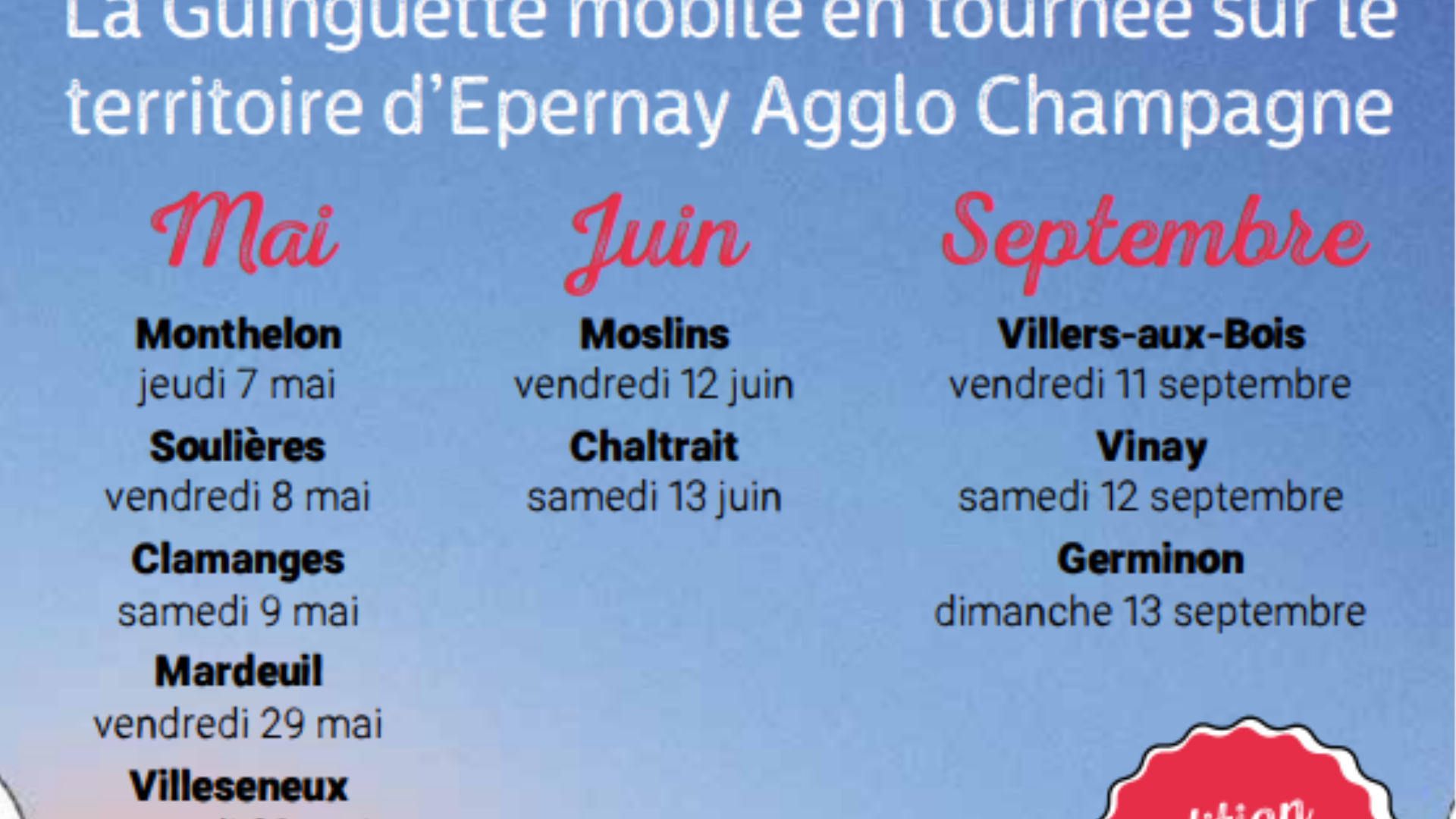 Voici la liste des 10 communes qui accueilleront la guinguette mobile en mai, juin et septembre prochains :