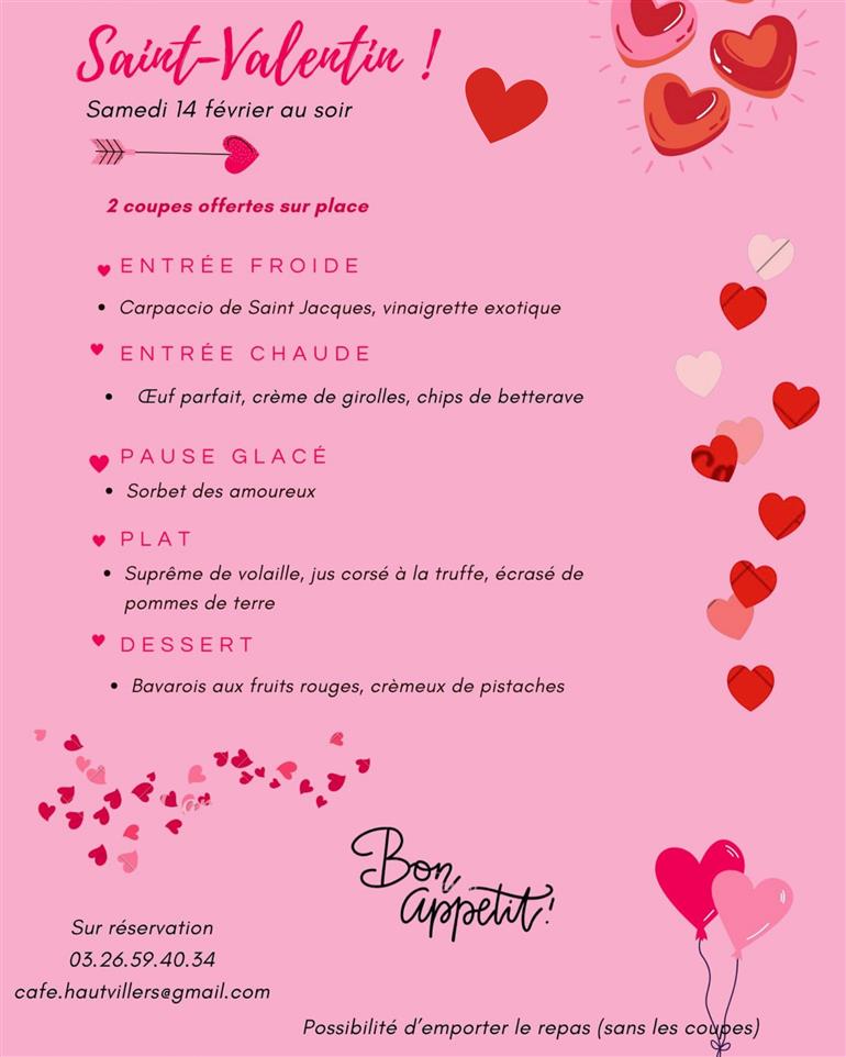 A l'occasion de cette soirée spéciale, un repas et une bouteille de champagne, ainsi qu'une surprise vous attendent le samedi 14 février.