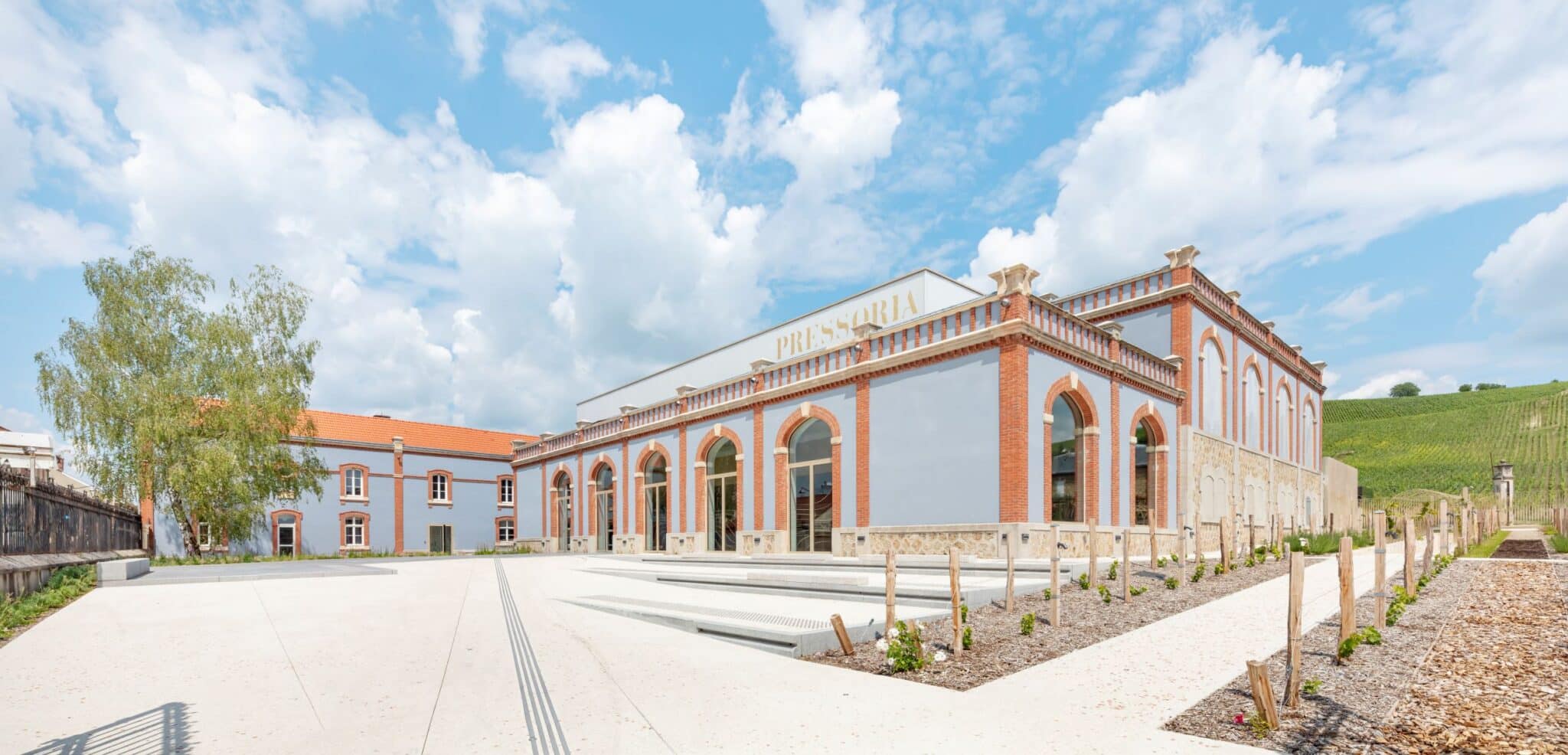 Pressoria mêle héritage culturel et design contemporain, avec une scénographie moderne et de nombreux espaces dédiés à l’événementiel pour introduire la Champagne viticole et le champagne à ses visiteurs.