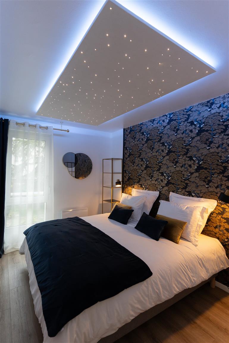 Geniet van het kingsize bed van hotelkwaliteit (180 x 200 cm) met XXL sterrenhemel, of ontspan in het knusse comfort van de queensize slaapbank (160 x 200 cm).